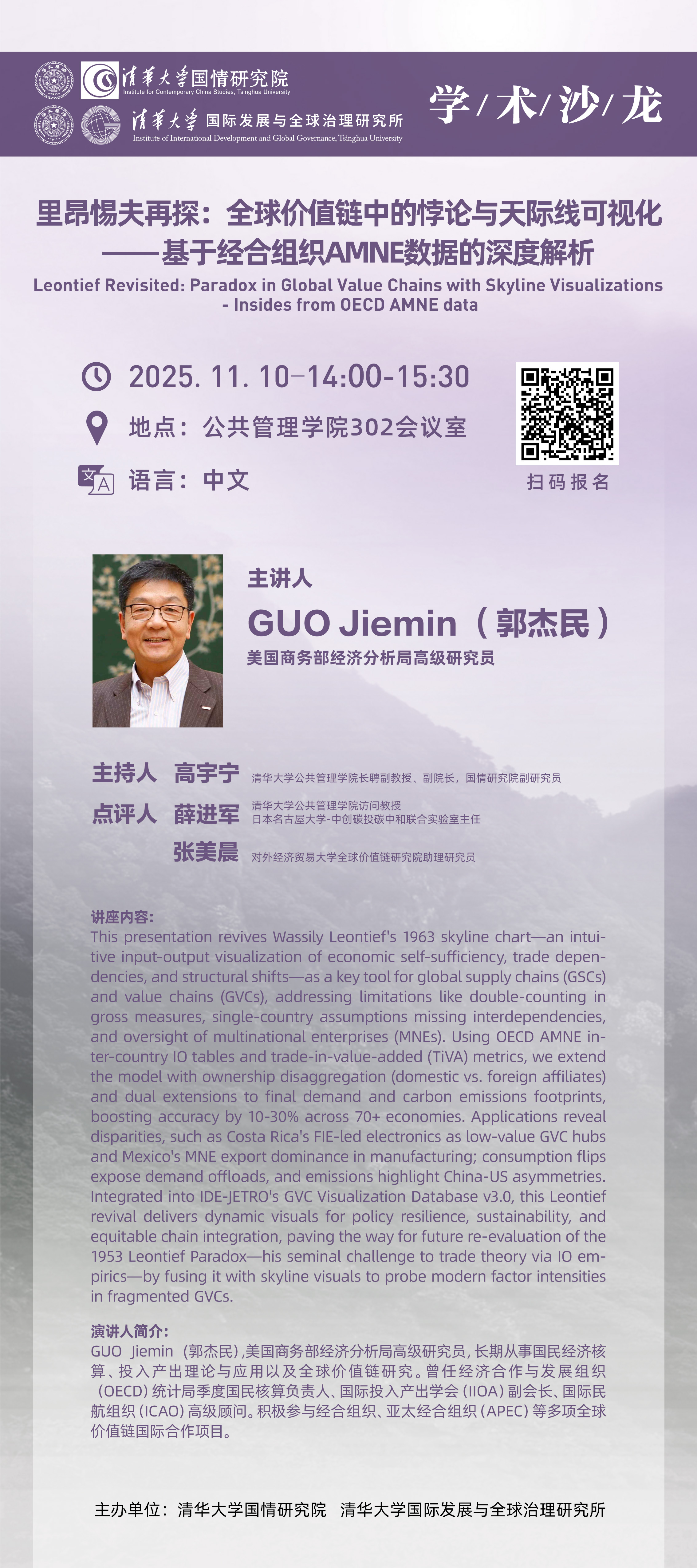 GUO Jiemin(郭杰民),美国商务部经济分析局高级研究员,长期从事国民经济核算、投入产出理论与应用以及全球价值链研究。曾任经济合作与发展组织(OECD)统计局季度国民核算负责人、国际投入产出学会(IIOA)副会长、国际民航组织(ICAO)高级顾问。积极参与经合组织、亚太经合组织(APEC)等多项全球价值链国际合作项目。
