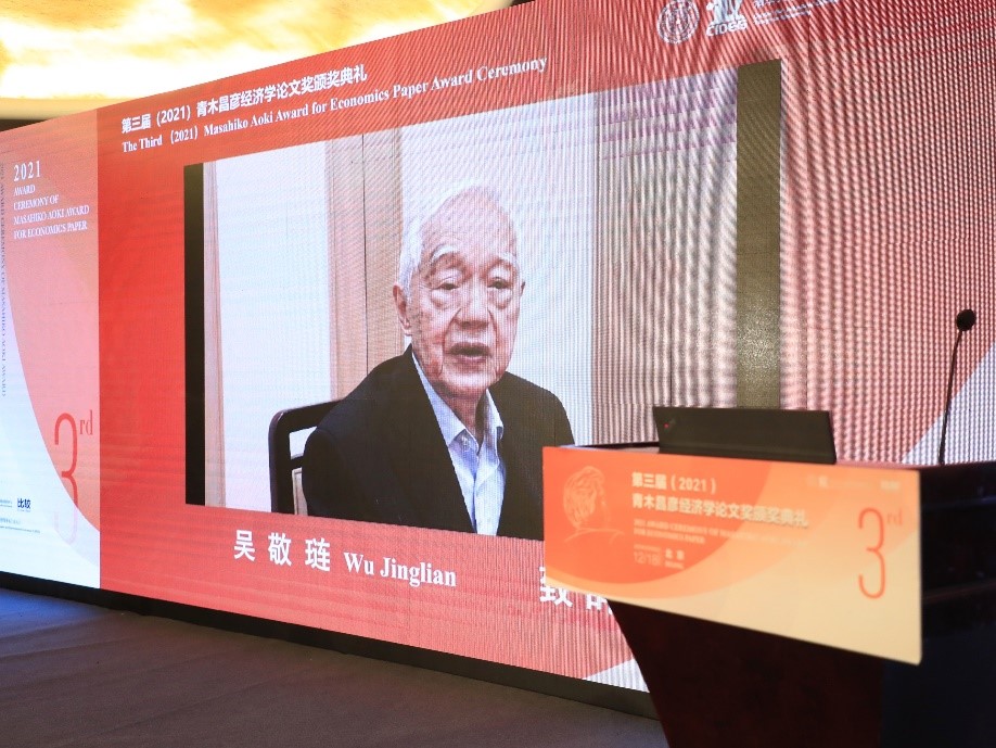 颁奖典礼首先由青木昌彦经济学论文奖评审委员会主席吴敬琏致辞。吴敬琏在致辞中回顾了青木昌彦教授对产业发展、环境治理和制度变迁领域的关注,重申了奖项设立的初衷,并对今年进入复审的论文予以高度评价。他认为入选的论文在理论深度或者使用的分析方法上都有很大的进步与提高,并非简单的就事论事,而是真正对于一些基本制度问题、发展理念问题、重要的经济学问题,甚至社会学问题试图作出学理性的回答。希望获奖的作者们今后能够百尺竿头,更进一步,在学术创新和政策实践中作出贡献。