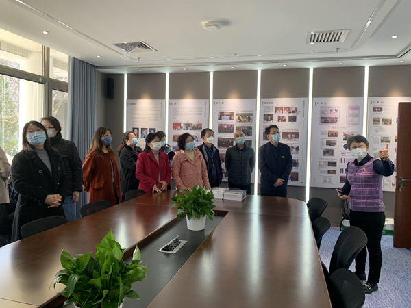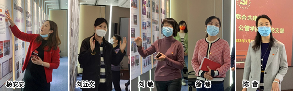 谢矜及公管学院教学办主任杨安安、学生事务办主任刘近文、科研办主任刘敏、国际合作与交流办主任徐臻等各业务部门同事分别对学院院史馆的建立背景、设计理念、学院发展的总脉络以及学院各项业务20年来的发展历程进行了介绍。