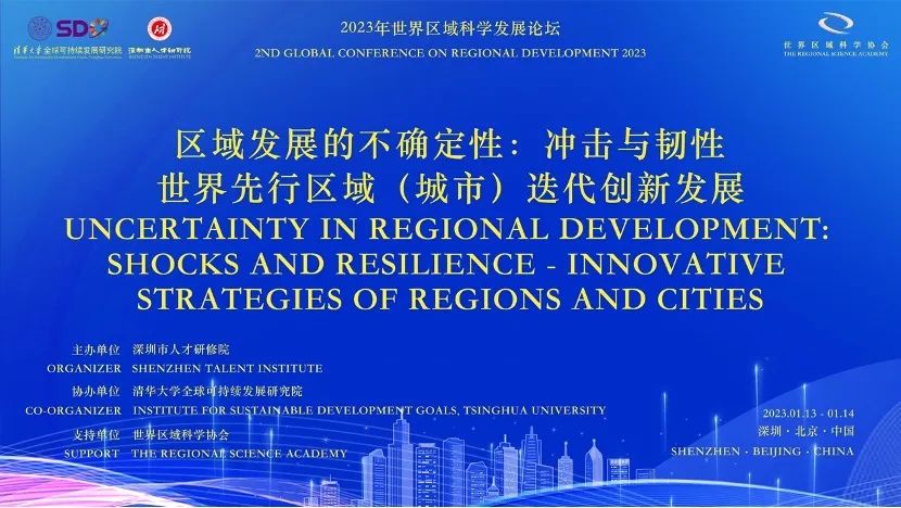 2023年1月13日至14日,由深圳市人才研修院主办,清华大学全球可持续发展研究院协办,世界区域科学协会(TRSA)支持的“2023年世界区域科学发展论坛”在深圳市人才研修院成功举办。本次论坛是 2021 年世界区域科学发展论坛的延续,由荷兰皇家科学院院士彼得·尼茨坎普教授与清华大学公共管理学院于永达教授共同学术召集。论坛以“区域发展的不确定性:冲击与韧性——世界先行区域(城市)迭代创新发展”为主题,来自全球22个国家和地区的近百位顶尖专家学者围绕该主题进行了深入探讨与交流。