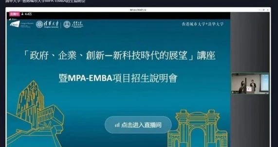 11月17日晚,清华大学公共管理学院和香港城市大学商学院在香港城市大学联合举办“政府、企业、创新—新科技时代的展望”讲座暨MPA-EMBA项目招生说明会,本次活动通过抖音及中国教育在线直播,共吸引到近五万参会者线上参加。