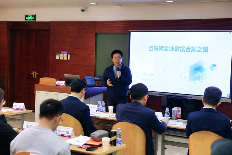 在结业汇报环节,阿里黄礼智、唯品会周禹、百度季石磊代表研修班三个小组,分别从公共数据授权运营、企业合规体系建设、数据要素流通体系建设等专题做成果展示与汇报。