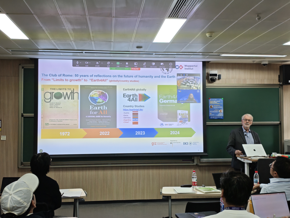 亨尼西克教授主要围绕德国“Earth4All”倡议实践与全球环境挑战展开论述。首先,他介绍“Earth4All”倡议已引发100多场后续活动及畅销书反响,强调若此类理念能在德国成功落地,未来或可推广至其他国家(如中国)。随后,他转向全球环境问题,指出全球平均气温显著上升,二氧化碳排放问题仍未解决,工业化国家需制定更适配的政策;同时以德国为例,提到两年前极端天气造成约 40 亿欧元损失的现实冲击。